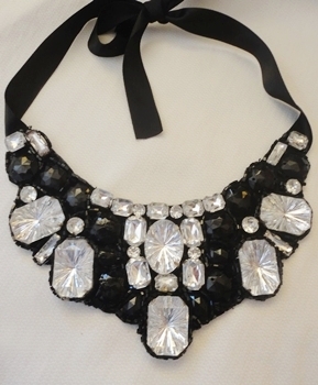- Assim que tiver a base de feltro pronta, comece a colar as pedras de maiores dimensões e as que mais se irão destacar, dispondo-as aleatoriamente, ao longo do colar. Tenha o cuidado de utilizar uma cola indicada para o efeito.